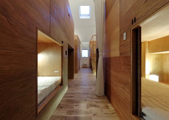 SUI guesthouse wears its timber elements very proud, leaving all the wood grain exposed. Stained plywood and raw pine posts blend with hardwood railings. The timber finishes juxtapose beautifully with the white plaster walls of the building envelope. The narrow walkways that weave between the wooden boxes form an elaborate network of passages and create a cosy atmosphere in the accommodation.