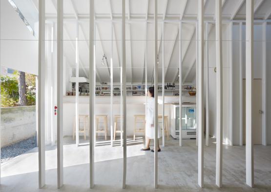 The Koyasan Guest House uses a typically western structural system of thin pine studs to create a network or vertical members. Japanese construction typically users less, larger members, but Alphaville chose to use thin framing in order to use the structural system as a perforated screening system as well.