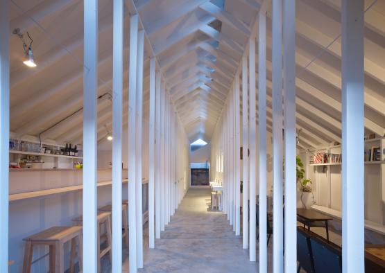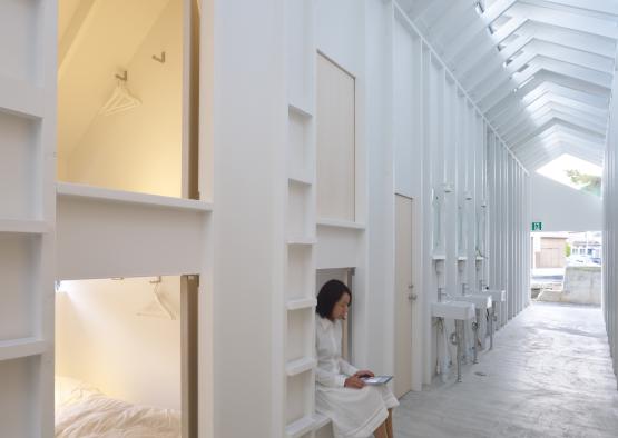 Koyasan guesthouse features a much brighter and singular interior palette. The timber studs have all been painted white, and resemble white birch trees in a forest. The white and bright interior juxtaposes with the dark metal exterior, which is aesthetically industrial. The orderly nature of the sleeping pods creates a calming atmosphere.