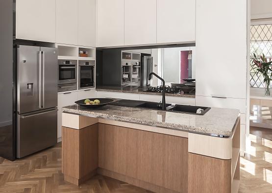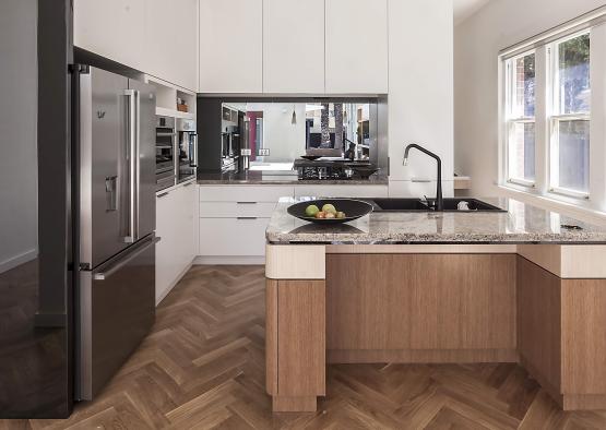 The Kitchen Island features two-toned reconstituted timber veneers from Ventech; Heritage Oak base with a slightly variegated rift grain, and a Snowflake highlight strip above, which features a more subtle dense rift grain. Intersecting at the end is a full panel of Snowflake back and shelves. All veneer panels are separated with matching shadow-lines. Together they complement the granite benchtop and marry the tones of the white cabinetry against the warmer oak parquetry.
