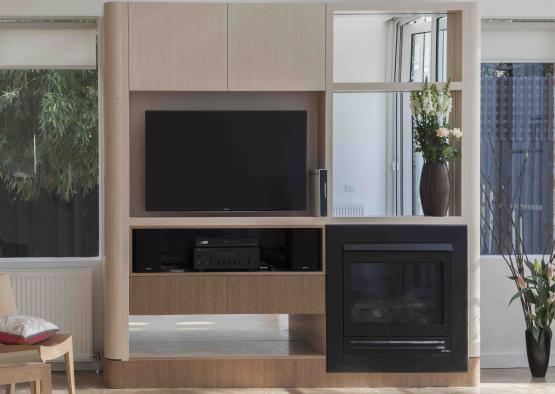 The TV/Fireplace Unit also is designed as a two-toned curved-corner unit to create visual interest and material intrigue, providing a warmer timber ‘base’ to the lighter front and sides of the enclosing fireplace, entertainment hub and visual centerpiece.