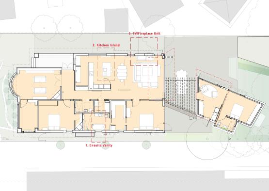 A suite of three timber-veneer joinery pieces was designed for the project. The pieces are originally inspired, when thinking of the main ensuite, by the client’s love of antique furniture and the ritual of a Victorian bedchamber with china washbowl and jug atop a turned-timber dresser. The idea was to recreate in joinery a contemporary vanity both as joinery-as-furniture, and joinery-as-heirloom, with the vanity featuring curved corners and a re-interpretation of the “white china washbowl and jug” as an integrated Corian top. This was extended to joinery pieces for the kitchen island and TV-Fireplace Unit.
