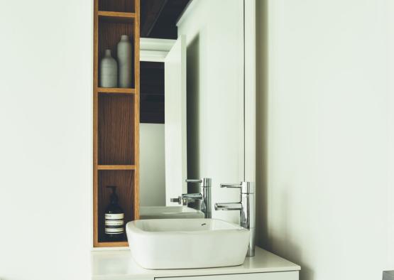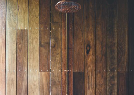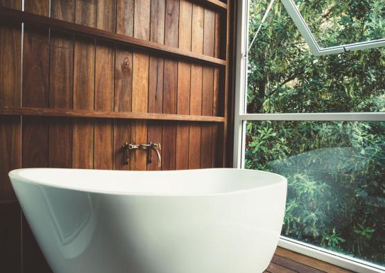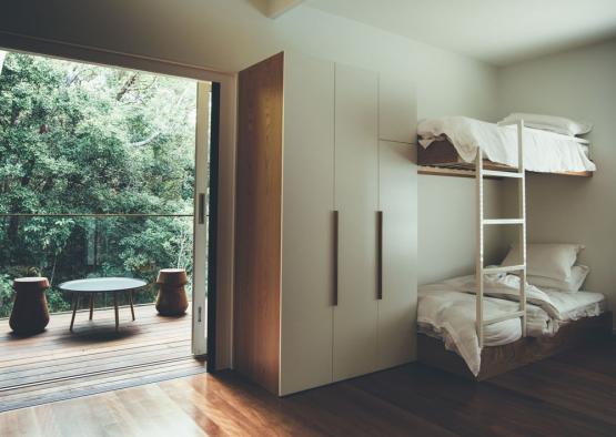 Originally the house was quite dark internally so a series of timber lined light wells were pushed up through the roof to allowed natural light to flow in from a high level, as well from the new openings in the brick walls. One of the most unique and delightful design elements of the new house is the semi outdoor bathrooms that look out onto the national park. The original house had an aged light brown plastic shower unit that sat on the back deck, where you could shower outside looking into the forest. The owners loved this feature, so we designed the new bathrooms as hardwood boxes with copper fittings that are largely open onto the private subtropical rainforest. The original hardwood flooring was revived and a select palette of materials was employed throughout the interior to maintain a modern and contemporary aesthetic. American Oak was employed throughout the joinery and interior feature walls for its warm complimentary tones.