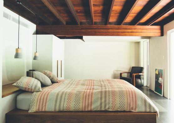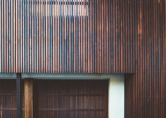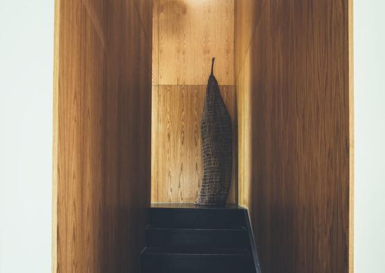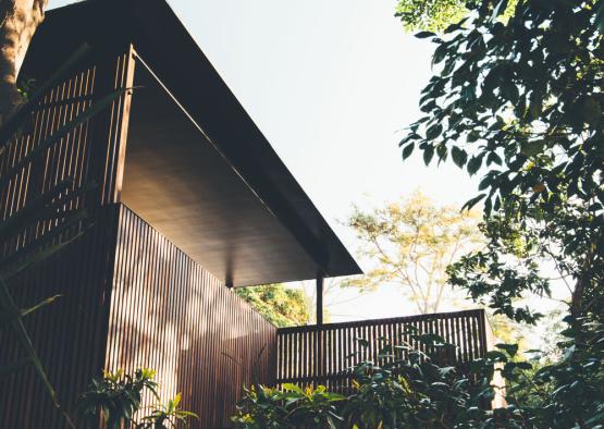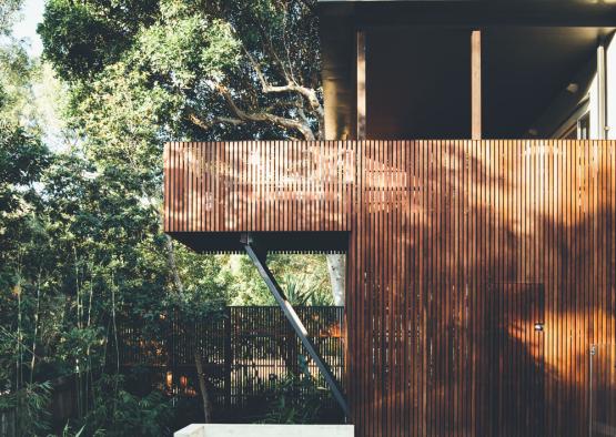 Sunday House utilises new lightweight timber structures in conjunction with the existing brick envelope to achieve sustainable design outcomes. An articulated hardwood timber screen spans across the street elevation to envelop the facade, acting as a secondary skin to provide protection from the morning sun. The screen frame is purposefully expressed, with the verticality of the timber battens designed to create a rapport between the building and surrounding rainforest. The internal timber structure has been selectively expressed throughout the house interior to complement the refined timber structure on the exterior of the house.