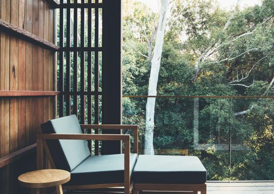One of the challenges with the existing house is that it did not take full advantage of the wonderful location backing onto Noosa National Park. The rear of the house was largely a solid brick wall looking onto this beautiful view. We proposed carving out a series of new openings in the rear wall so that bedrooms and bathrooms would look out onto this very private serene landscape. The new openings in the building envelope were lined with hardwood timber that folded around the space to frame views out to the surrounding landscape. The other significant challenge to modernise the existing house was how to transform the front street elevation. The original house had an unflattering rough dark brown brick facade with two equally mission brown garage roller doors. A separate consideration was that the street elevation faced east and hot morning sun would blast in through the kitchen and dining windows in summer. Our approach was to render the brick in a natural cement finish and design a beautiful timber screen that sat in front of the original facade. This lightweight hardwood structure resulted in a refined modern elevation to the street, while also providing sun protection and privacy for the internal spaces. Australian Spotted-gum was specified for all exterior cladding, screens, detailing and decking, with the screens designed to be low maintenance and left to grey with age.