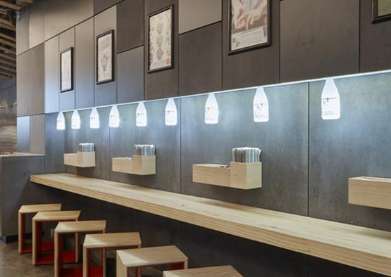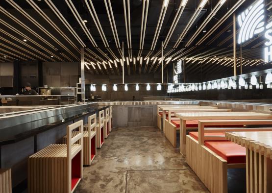 Lighting is fully integrated into the timber landscape creating an additional organic form within the centre of the feature. This connects the entire store from front to back, forming a holistic and encapsulating spatial experience. A simple timber dowel is used to create a three-dimensional form that creates interest and movement within the store. The design language of the timber dowel form flows onto the furniture within the store, including the booths and stools surrounding the sushi train, creating a holistic approach to design as well as alluding to the brand's beginnings.
