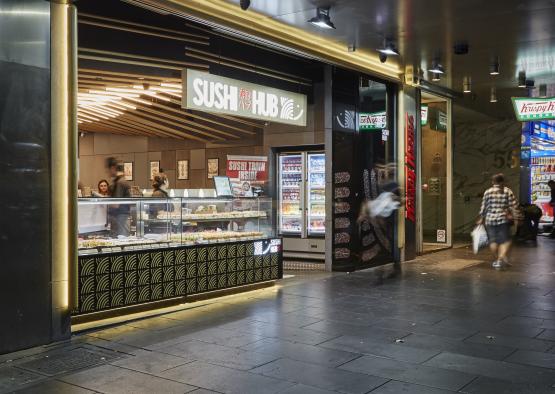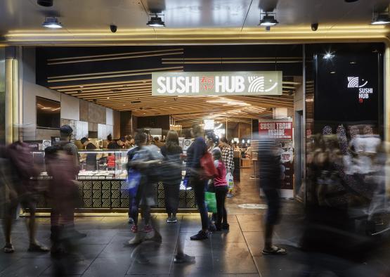 Sushi Hub on Swanston Street translates elements of traditional Japanese artwork and the brand’s origins into a busy CBD setting.