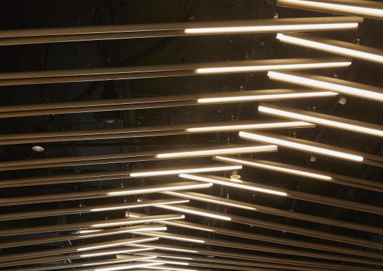 The dynamic, sculptural form of the ceiling feature creates a wave-like effect, consistently constructed of timber dowel. This envelope effect creates a high visual impact, particularly to the bustling Swanston Street location. Lighting is integrated in order to highlight the three-dimensional effect of the sculptural form, which is inspired by the logo identity of the Sushi Hub brand.