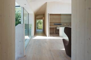 Architect King says an over-sailing wide first floor corridor is animated by tilted ceiling planes, creating a ripple effect and a feeling of momentum towards views to the east and west through large windows at either end.