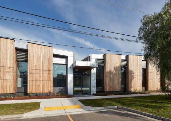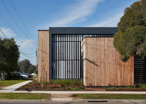 Timber cladding was chosen as it is a reference to something living, rather than an artificial material which reinforces the idea of community, being a natural product it connects the end user with the natural environment. For this project the existing facility-facade was re clad using the same Blackbutt timber as the new facility to create a single community identity.