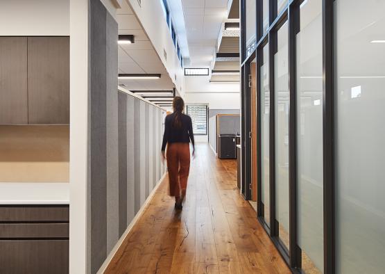 The internal surfaces, be they walls, partitions or ceilings, are acoustically treated. Some of the walls also feature acoustically-treated fabrics (up to 2.4 metres) to make open plan offices comfortable to work in. All internal timber used low VOC coatings and natural oil.