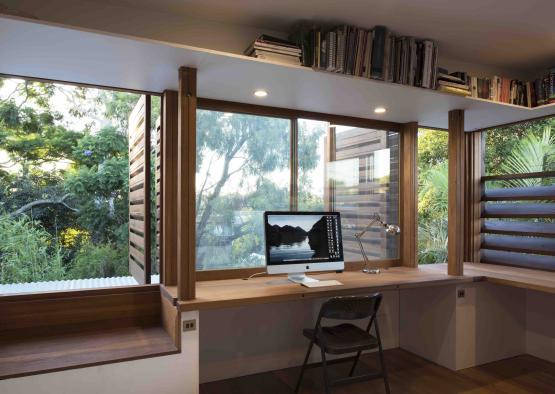 The project was owner built with the assistance of a talented and collaborative construction team. Our ideas on how to shape the project progressed to a point that we committed to hand crafting almost everything in timber. Not only was the structure handmade, but so was the internal wall lining, shelving, the kitchen bench, inbuilt furniture, two staircases, the first floor shutters and screens, all fixed glazing, and the front door and security screen.