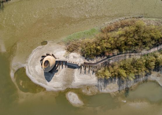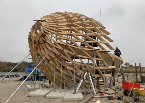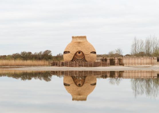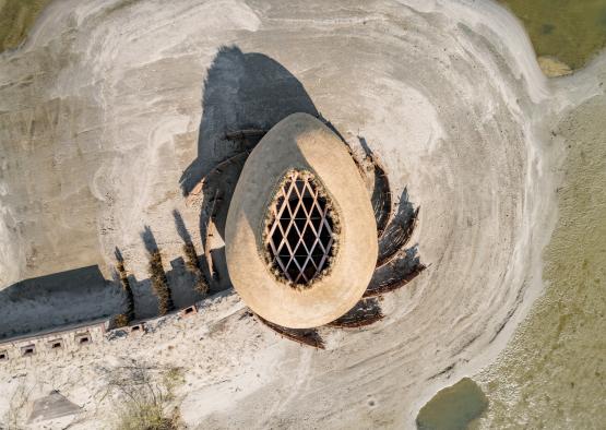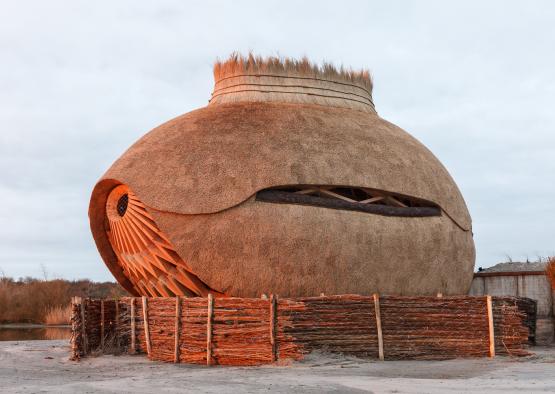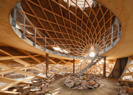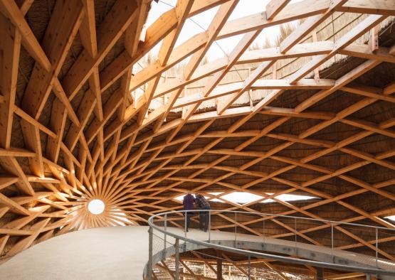 The observatory not only takes aesthetic cues from the egg, but also its structural makeup. A ‘nest’ that houses the egg has ‘feathers’, made up of structural chestnut posts, surrounded by reeds and dunes, which partially bury the egg.