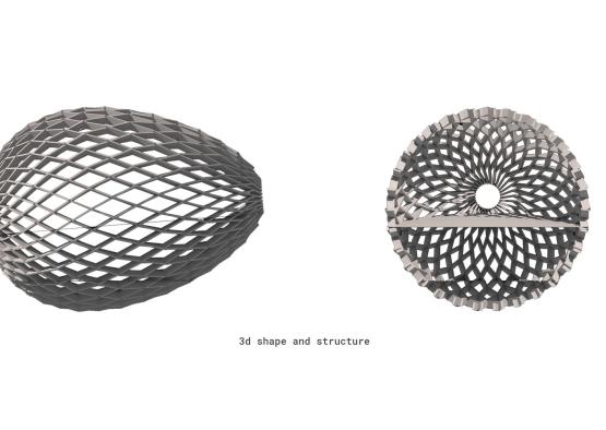 The spherical ‘egg’ body was generated parametrically via CAD software, allowing the extremely accurate makeup of the individual timber members to be fabricated with a CNC router off-site. 3D modelling of the project allowed experimentation and precision in achieving the best strength-to-weight ratio, form building, and choosing where openings would cut.