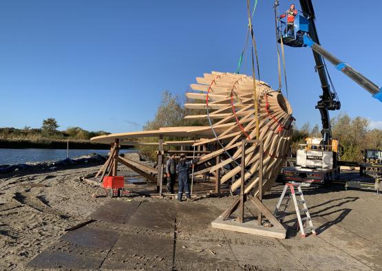 The whole structure is made from 402 parts, all cut in a factory, and all assembled on site. The parts can be easily disassembled and reassembled at a new site, and in combination with the natural material use, the life cycle of the project is almost completely circular and sustainable.