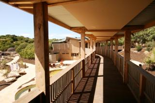 A serpentine path winds through the dappled shade of dense Tea Tree along the edge of the carpark to an entry ramp and an elevated, covered and screened timber walkway with changing vignettes of intimate corners and the wider landscape. Another walkway leads from the main building to the changing rooms and the springs, allowing for protection from the elements and involvement with the surrounding environment.