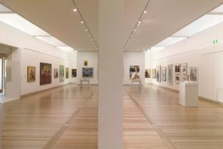The floors of the permanent galleries are Southern Blue Gum, while Spotted Gum is used in the temporary galleries. Both are laid in a pattern that mirrors the ceiling track lighting and incorporates integrated service points for the flexibility of future exhibitions.