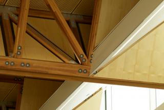 The timber frame of the building is simple: the roof of each pavilion is constructed from prefabricated timber trusses spanning 12 metres. The depth of the trusses enhances the gallery's long-term flexibility, as an accessible roof space makes lighting and equipment easily modifiable. The prefabrication afforded significant cost and time savings, while being consistent with a single direct expression of form, function, structure and materials.