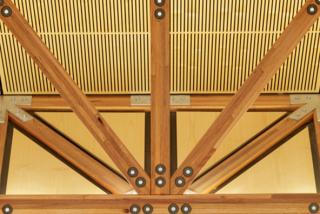 Timber adds a fine grain human scale that counterpoints the structural concrete walls flanking the gallery's five main pavilions. Externally, the end soffit of each gallery pavilion is clad with Hoop Pine plywood in a pattern that relates to the internal truss structure of the roof. This plywood cladding extends for the length and width of the entrance hall, and encases a series of both LVL Radiata Pine and glulam Victorian Ash roof trusses. In the interior, one side of the roof trusses is left unclad to expose the structure visually.