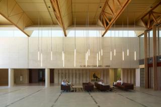 Simplicity and directness are fundamental to the design of the National Portrait Gallery. A building of human scale was required, one that was open, inviting and accessible, at the same time as being suitable for the display of portraiture. The building is linked to the surrounding landscape both by the way it captures the quality of natural light, and by its use of materials that represent Australia's diverse natural resources. Among these materials, timber is one of the most important.