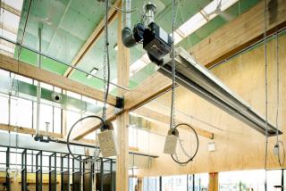 The main double-height workshop on the north side that houses the furniture workshop features timber extensively with the exposed wood of cross-beams reflected in the work benches that fill the space and the plywood clad offices/ classrooms that look over the voluminous space.