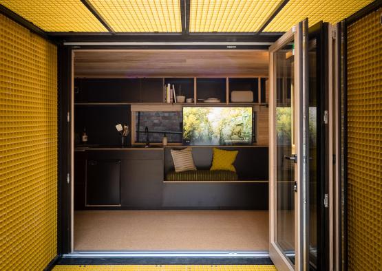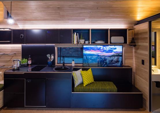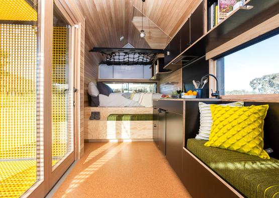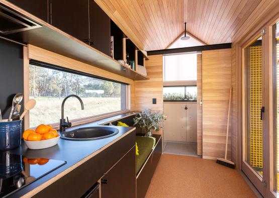 The Tiny Home interior is finished with radial sawn Victorian hardwood. Cork flooring panels were used as a sustainable and practical floor finish. Form ply joinery was a practical solution for the seating and cabinetry, matching the exterior colour palette.