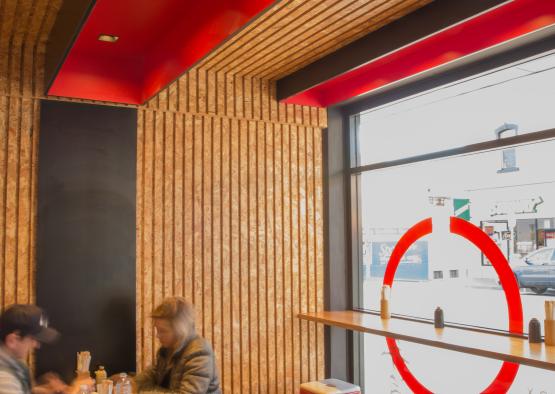 OSB has been used in a series of ways throughout the interior: it has been cut into battens to create vertical elements, subtly referencing Japanese architecture; it is a background for crisp white branding on walls; it has been painted black, the shiny finish showcasing the textural element of the board; and it has been used for furniture elements. OSB panels perfectly offset the cool, utilitarian nature of the concrete floors, while providing a unified interior that is consistent across the two locations. OSB provides interest and texture to the spaces, while acting as a brand identifier that is instantly visible from the street.
