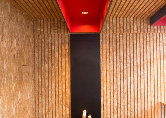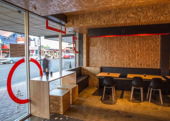 The bold interior of the Hobart and Moonah Bento Box form a cohesive, recognisable branding for the franchise, highlighted by the strong use of oriented strand board (OSB). Developed together as a single concept, the interiors were conceived as an abstracted unfolded box, like the containers in which traditional Japanese bento takeaway is served. The consciously crafted interior lining was juxtaposed with an inexpensive mass-produced construction material. OSB was also chosen because of its warm natural quality and appearance that references textures such as rice, paper screens or wooden matting, as well as other aspects of Japanese culture. Our client wanted to try and capture the ‘energy’ of Tokyo’s street life: the OSB reflected this in its random grain composition while also forming a calm background that accentuated intense splashes of red and black – the branding of the franchise.