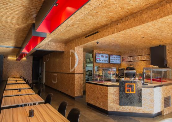 OSB panels have been used as an internal lining across the wall and ceilings throughout the Bento franchises. They successfully tie the interiors together and provide a recognisable brand for the business. Coated with clear polyurethane and in some instances painted black, OSB provides an inexpensive, interesting and practical alternative to plasterboard.