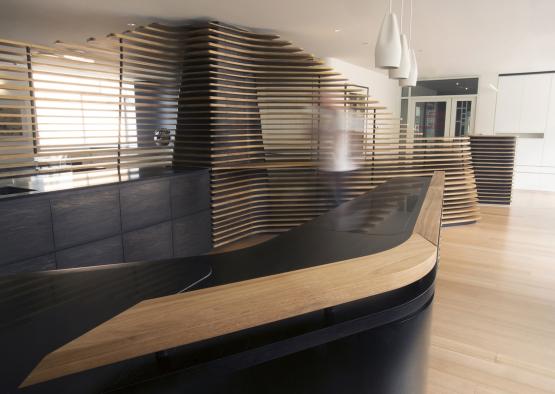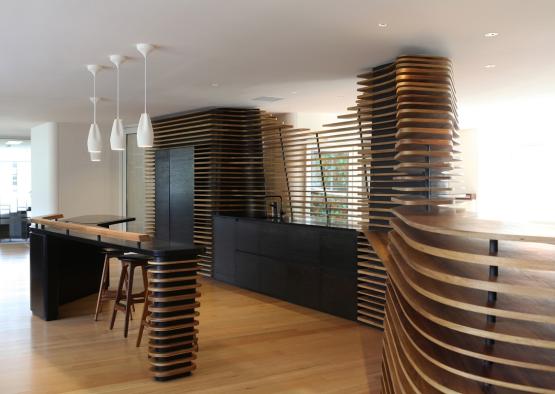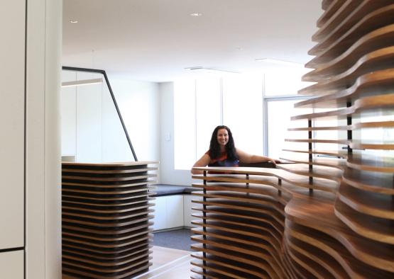 The timber spine, a collaboration with alumnus designer-maker Scott van Tuil, consisting of over 400 hand-finished pieces, elevates Tasmanian Blackwood timber veneer with minimal waste and sustainably managed resources, and promotes a synthesis of traditional handcrafted jointing and fabricating with modern Parametric Design and CNC routing technology.