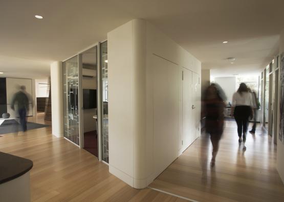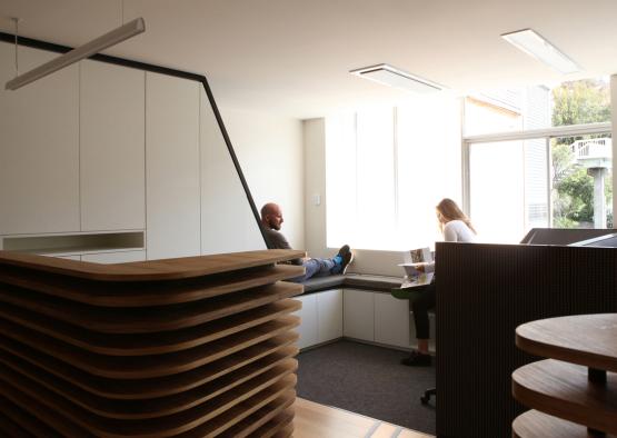 This project transforms an outdated office space. Celebrating connection to place and global connections, the timber feature spine speaks of the importance of cross-disciplinary exchange.
