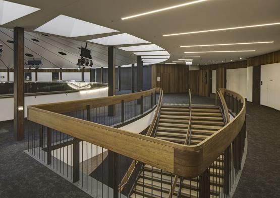 The timber panels create a useful barrier, concealing building services including smoke, and hydraulic risers. Custom batten screens were used to provide a barrier between utilitarian spaces like amenity entrances and the main auditorium.