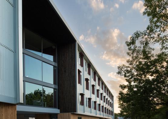 A system of prefabricated modular timber-framed construction stacked 120 self-contained student apartments three storeys high without the need for additional support structure.
