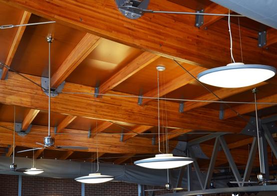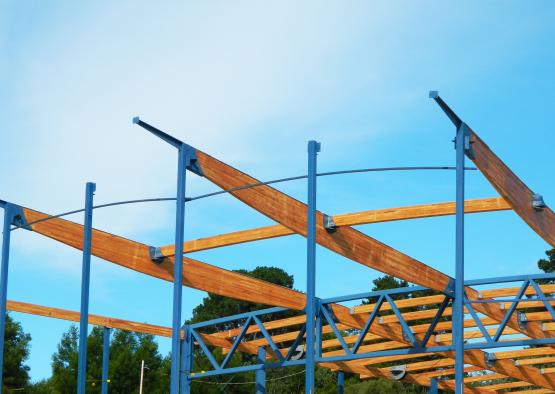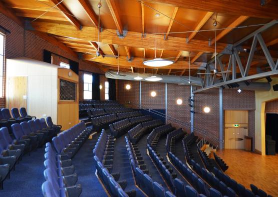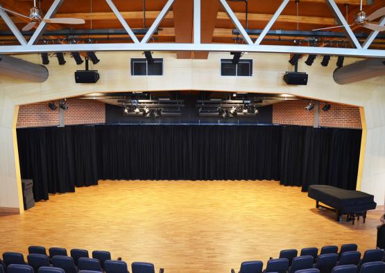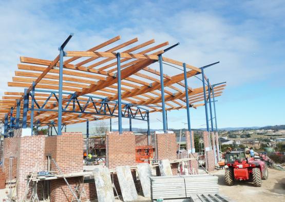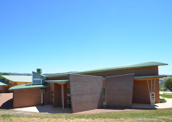 Orana’s Overture Hall incorporates beautifully crafted timber into the practical and intelligent design in several ways. The curved ceiling was constructed using beams that were shaped and bolted together in a radial geometry, which gives the effect of a beautiful spine-like structure. The glu-laminated beams were fitted with custom organic steel brackets to house the curved roofing purlins, which run at 90 degrees to the beams, creating a wedge-shaped, cylinder roof profile. The proscenium arch of the stage was created with a glue laminated beam structure and panelled with fire rated bamboo plywood and blackbutt solid timber panelling. The terraced floor system was custom made on-site to suit terrace seating and ventilation from the solar corridor. Shaped timber beams were used outside the building to hold up the canterleaver roof and continue the metaphor of the building as an organism and a vessel for music and performance.