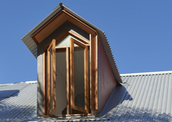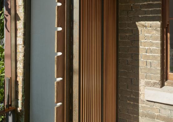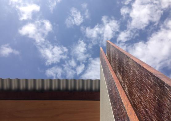 The plywood soffits – splayed exterior and flat interior – function as lead-ins to the doorframes, emphasising a relationship between inside and outside spaces. The exterior soffits splay towards the doorframes to frame and emphasise the entryway of each bifold. The pattern of the Kauri pine, accentuated slightly by the clear coating, is subtle and sophisticated, contrasting its pale complexion with the deep red-brown of the recycled hardwood nosing and the rich orange brown of the cedar bi-folds. The machined galvanised-finish corrugated edge of the colorbond roof sheets against the plywood soffits juxtaposes the texture of the corrugation with the pristine finish of the satin plywood surface.