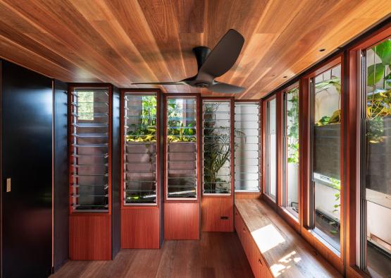 The upper floor features spotted gum timber flooring and a recycled timber island bench. A colonnade of thin steel blade columns hosts western red cedar framed glass louvres.