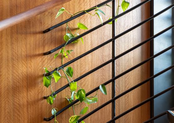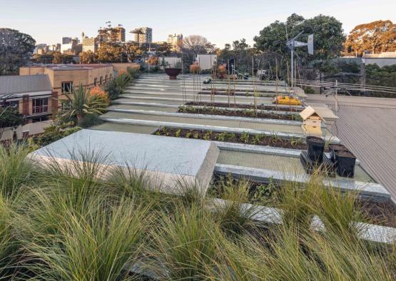 Overhead structural LVL beams support the rooftop garden, which features an array of hot dip galvanised planter beds. The LVL beams are left exposed underside, developing a rhythm to the internal space. LVL beams are thick, engineered beams made from veneers of timber, much like plywood. LVL rivals and often exceeds the strength of solid timber beams. Precise and accurate sizing of LVLs are one of the greatest benefits in terms of construction speed, but when they are cleaned up and left expressed within a space they provide a beautiful raw engineered aesthetic that can be perfectly complimented with plywood linings and joinery complimented by plywood joinery.
