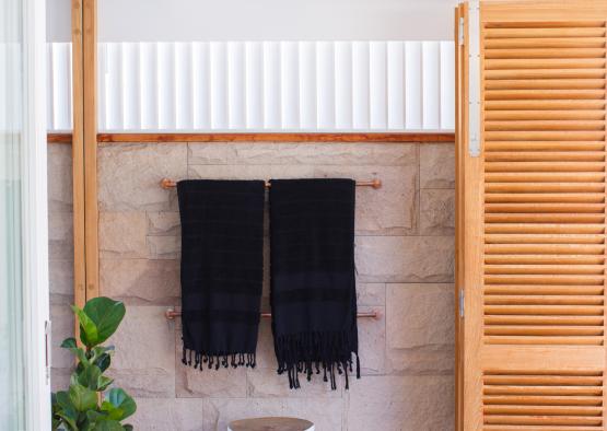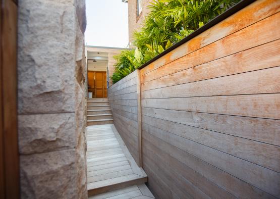 The external facades of the carport facing the public roads are clad in black stained cedar weatherboard. To add privacy and anonymity, the external faces of the carport were designed to be quite formal and secretive. The sawn weatherboard is the simplest of profiles that allows no unnecessary adornment. It also had to be durable, and horizontal timber cladding performs better with greater tolerance to natural movement than vertical timber cladding. Combined with the deep, dry looking stain “palm beach black”, the cladding provides a juxtaposition and vacant backdrop to the other materials that are unveiled as you journey through the site.
