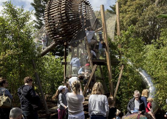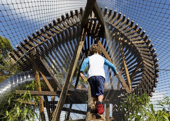Right from the projects conception, the team at ASPECT worked with Fleetwood Urban to create innovative timber solutions to the park equipment. Almost all of the structural elements are compromised of Australian hardwoods. The treehouse in the bamboo forest is made from Spotted Gum and Blackbutt, with steel tension rods pulling timber battens into the organic basket-like shape. The ‘Eel’ balance beam is constructed entirely from Grey Box, and timber decking and fencing throughout the project are also constructed from native hardwoods.