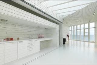 Inside, the Long studio is an elongated space, accented by the lines of the white painted pine planks and white kitchenette and work area.
