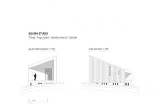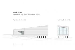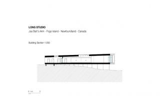 The architects say the intent is to “sample and allude to” local construction techniques: the spruce wood shell cites the clapboard of the ‘outports’, or local fishermen’s houses; the stilt construction of Newfoundland’s waterfront fishing sheds; and the proportions of the volumes and skewed frames, particularly in the case of the smaller studios.