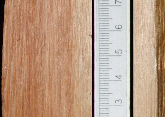 Sapwood pale yellow or white, fairly wide and usually clearly demarcated from the reddish-brown or pale red heartwood.  Texture (referring to vessel size) medium.  Grain mainly straight.  The figure is not prominent, and growth rings occasionally tending to distinct.